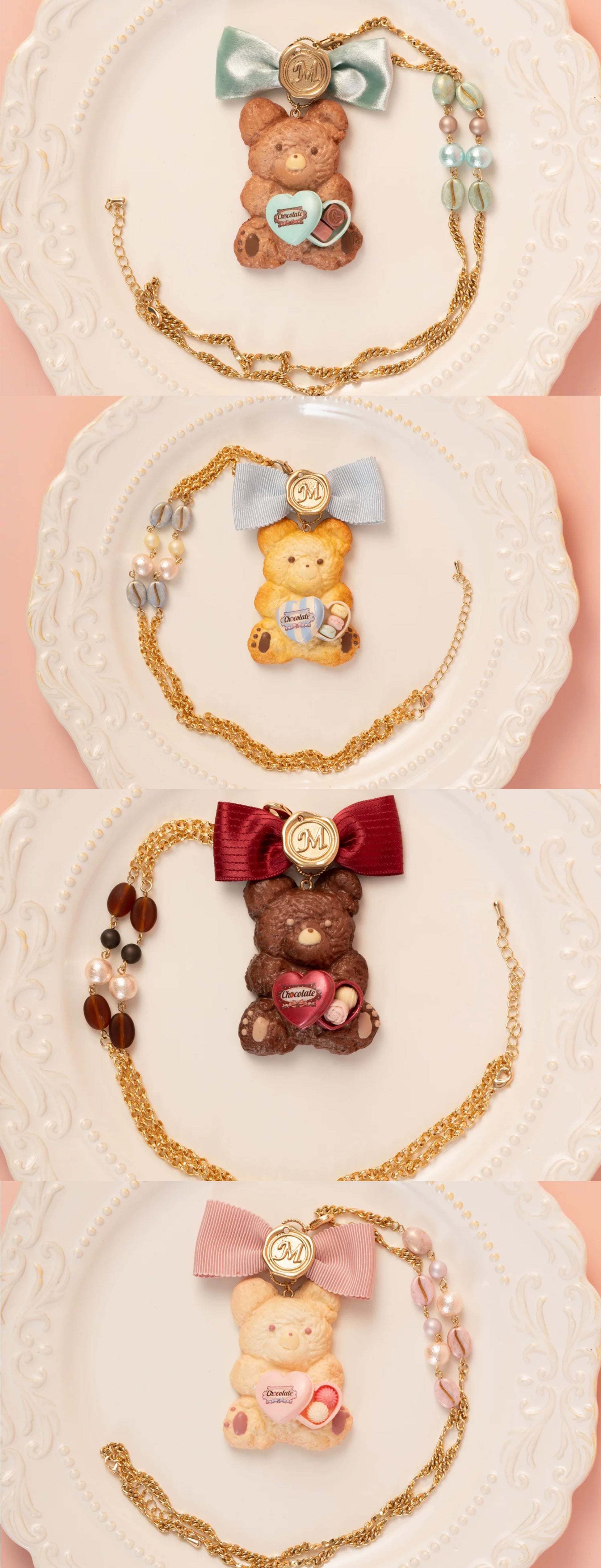 Look closely—each bear carries a unique gift, from pretty macarons to delicate bonbon chocolates. The necklace is delicately accented with cultured pearls and tiny coffee beans, making it a truly enchanting accessory.