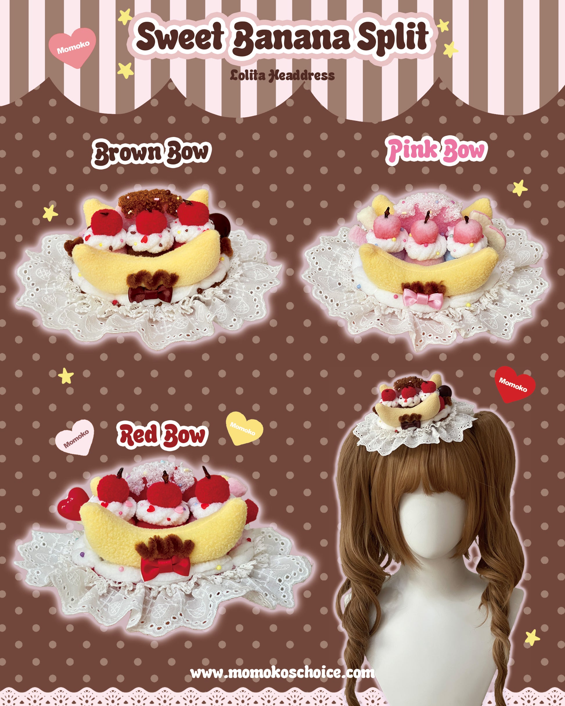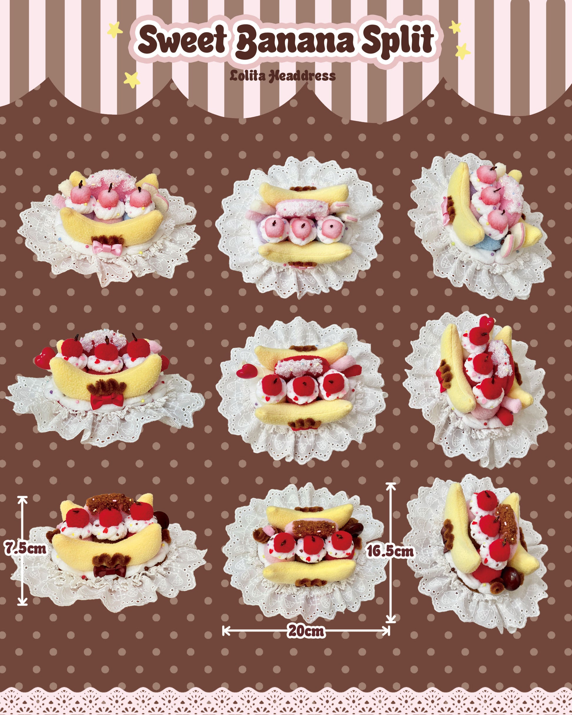 Sweet ice cream, cherries, bananas, and whipped cream are reimagined in cotton lace and plush fabric, making this headpiece a special and irreplaceable part of your Lolita style!